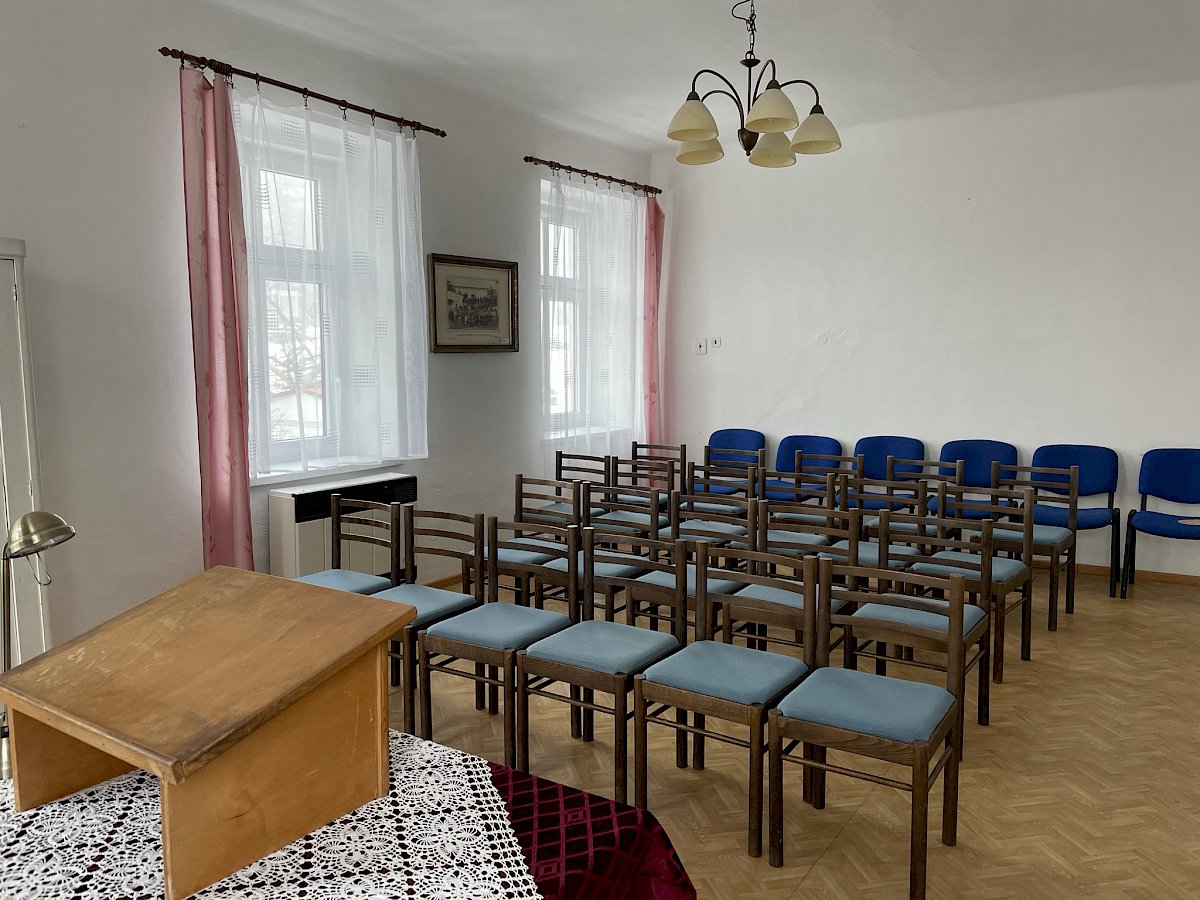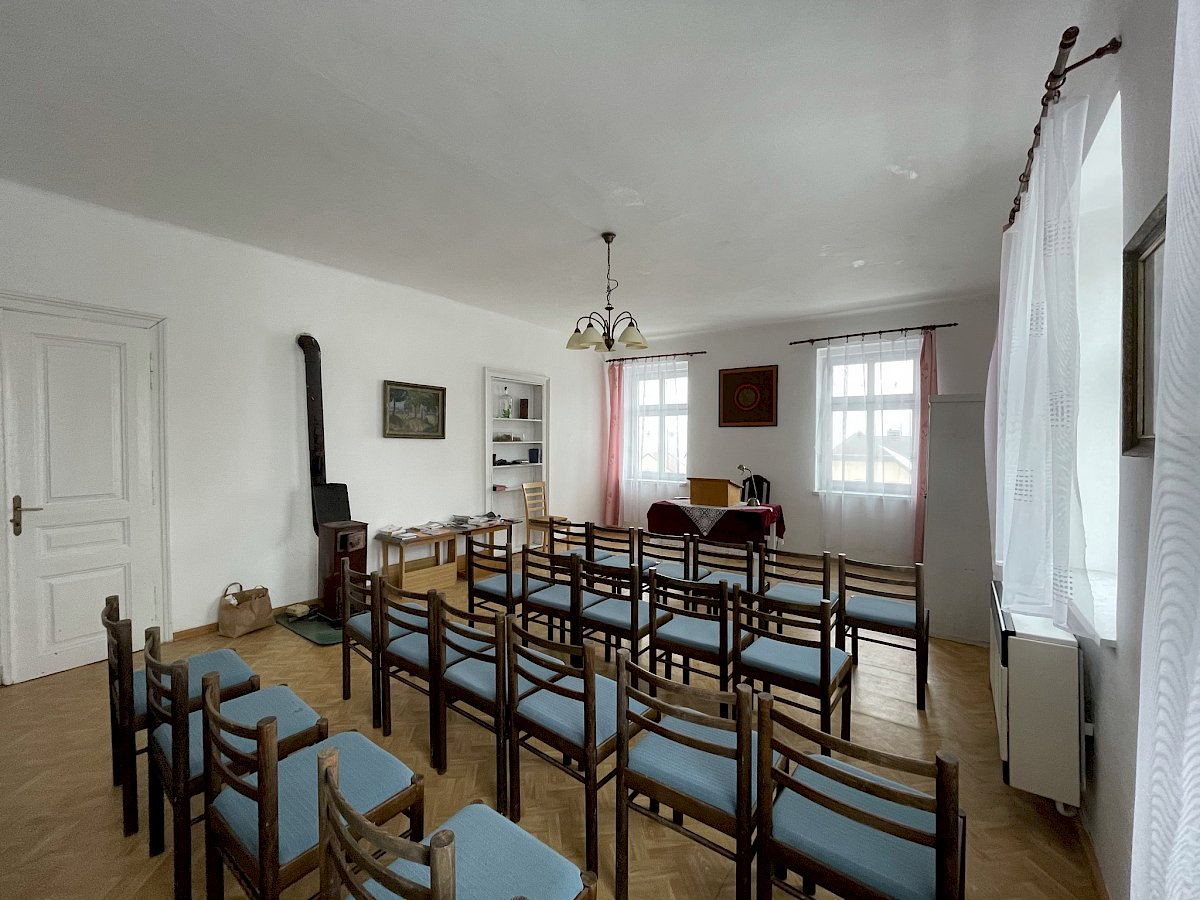 V horním patře jsou dvě ložnice – pro 4 a pro 7 osob. Dále je zde koupelna a WC. Sborová místnost v horním patře slouží pro potřeby sboru. V zimním období se zde vykonávají bohoslužby.